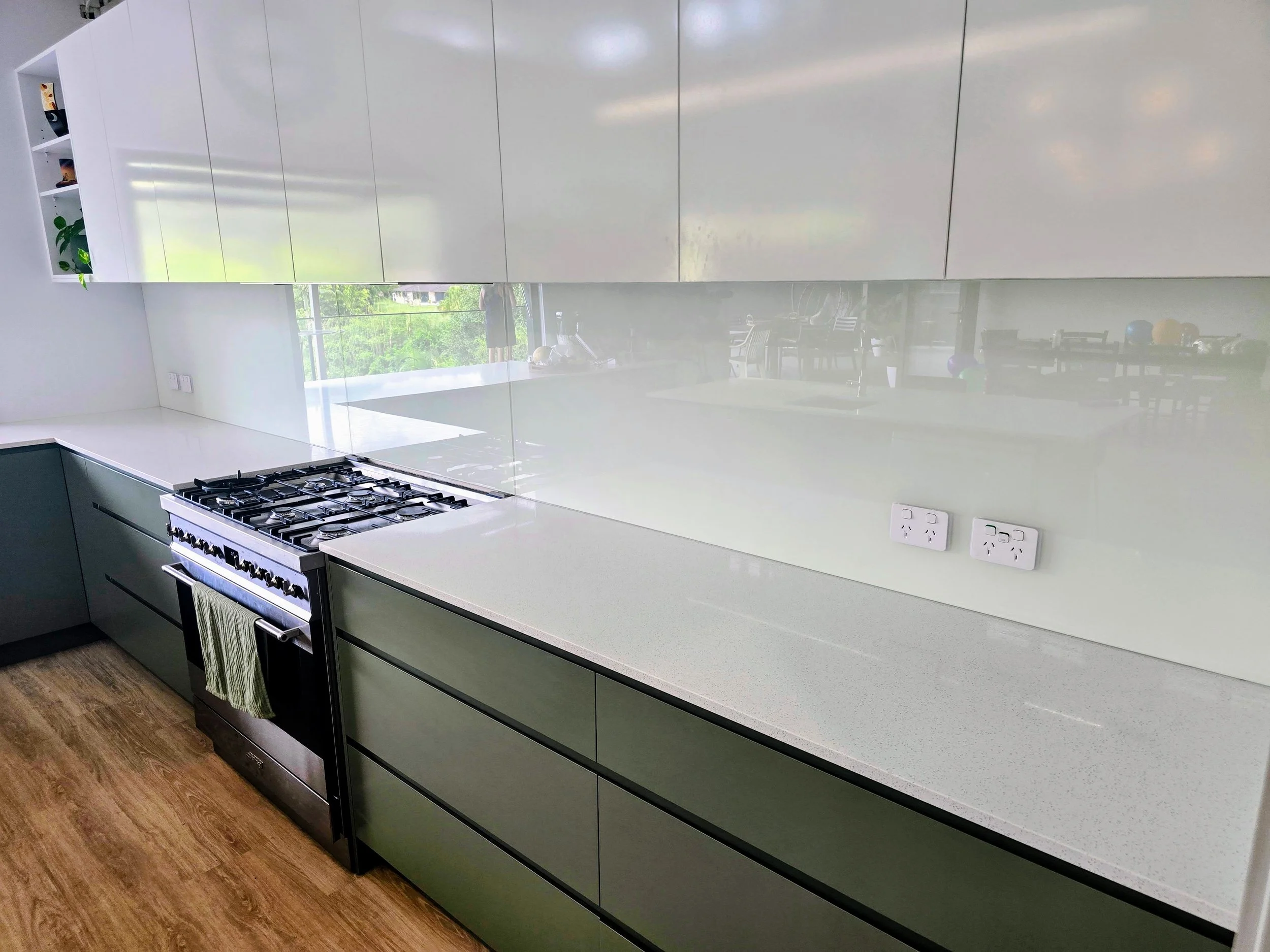 Custom glass splashbacks made to measure for a clean, modern finish. Available in a wide range of colours including low iron for crisp whites, with precise cut-outs for power points and fixtures. Durable, easy to clean, and designed to suit your space perfectly.